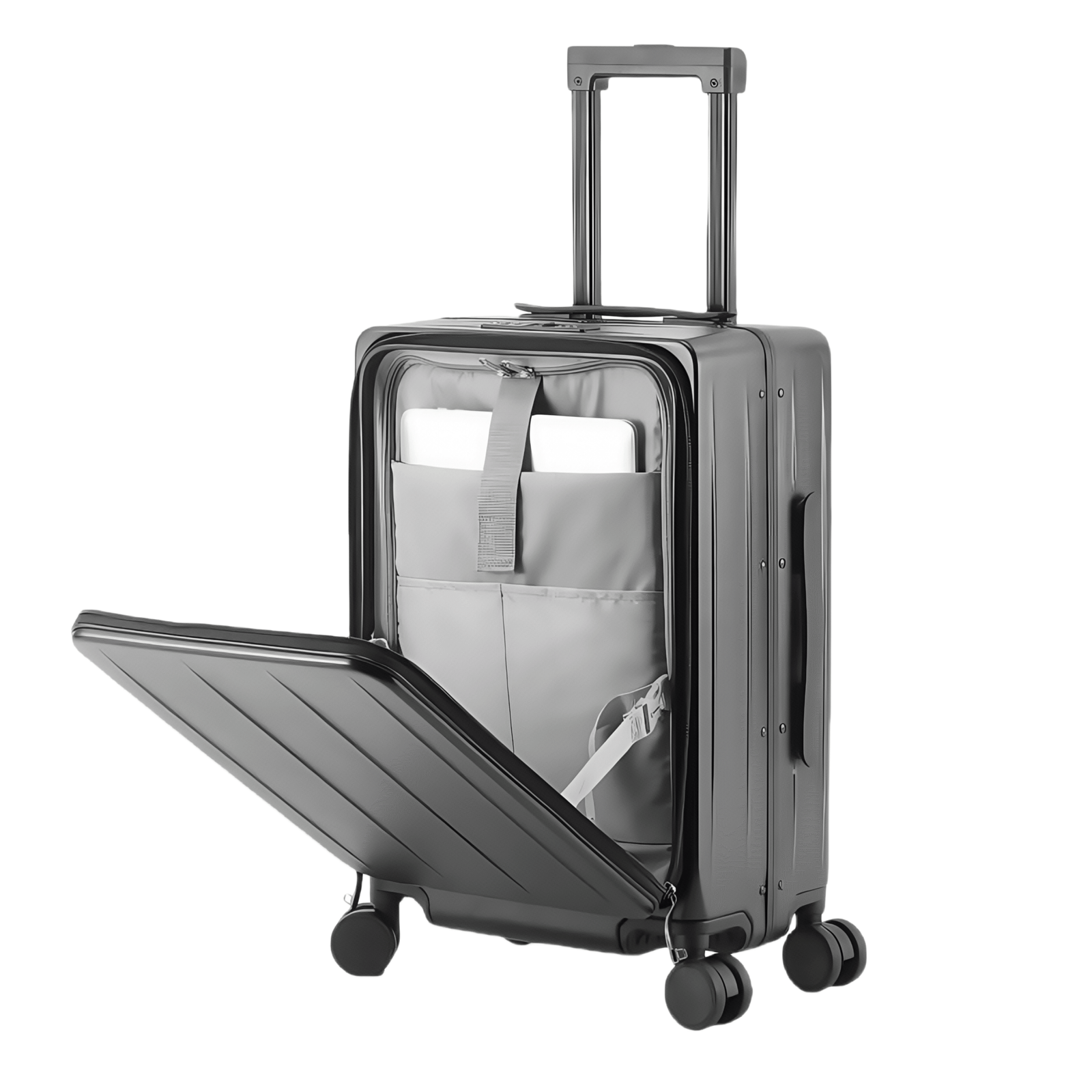 This innovative 20-inch multifunctional carry-on suitcase is perfect for smart travelers. It features a front-opening flap for easy access, a USB charging port for your mobile devices (power bank not included), and a foldable cup holder for drinks on the go. Lightweight yet durable, it fits into most overhead compartments and is ideal for business trips or weekend getaways.