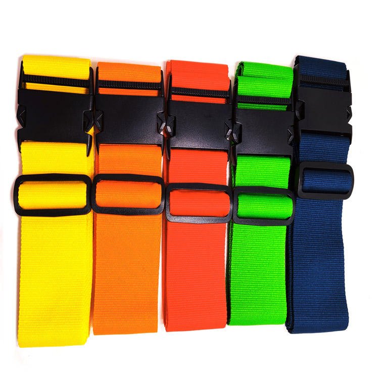 Keep your suitcase secure and stand out at the baggage carousel with this vibrant polyester luggage strap. Available in yellow, green, blue, and orange, this thick polypropylene tape provides enhanced visibility and security for your travel bags.